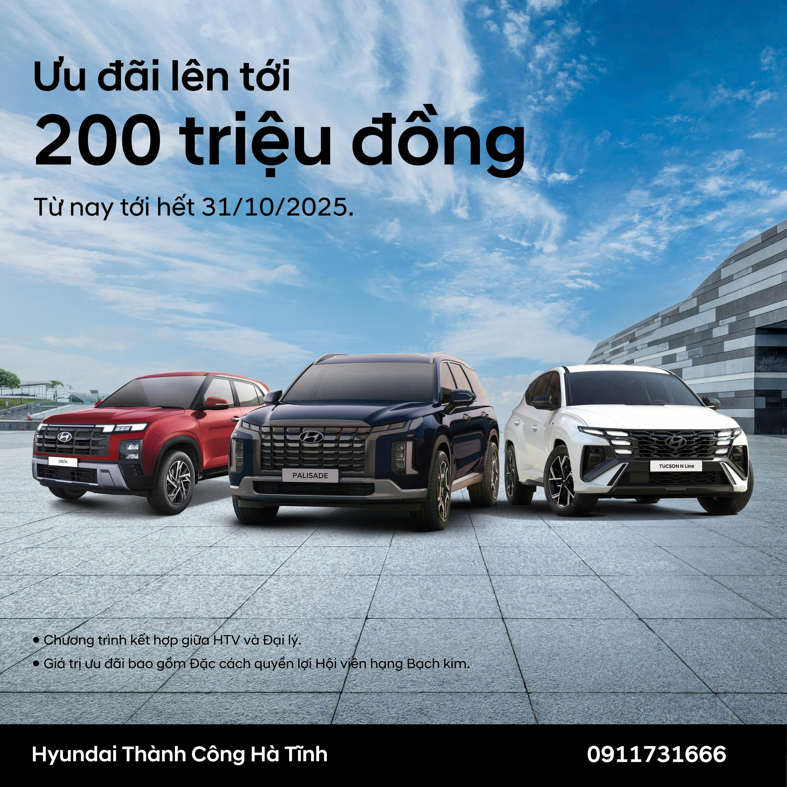Cụ thể, trong tháng 10, khách hàng khi chọn mua xe Hyundai Palisade, Hyundai Santa Fe, Hyundai Tucson, Hyundai Creta, Hyundai Accent, Hyundai Stargazer đều có cơ hội nhận được ưu đãi lên đến 200 triệu đồng, trong đó bao gồm quyền lợi Hội viên khách hàng Hyundai hạng Bạch Kim trị giá 10 triệu đồng.